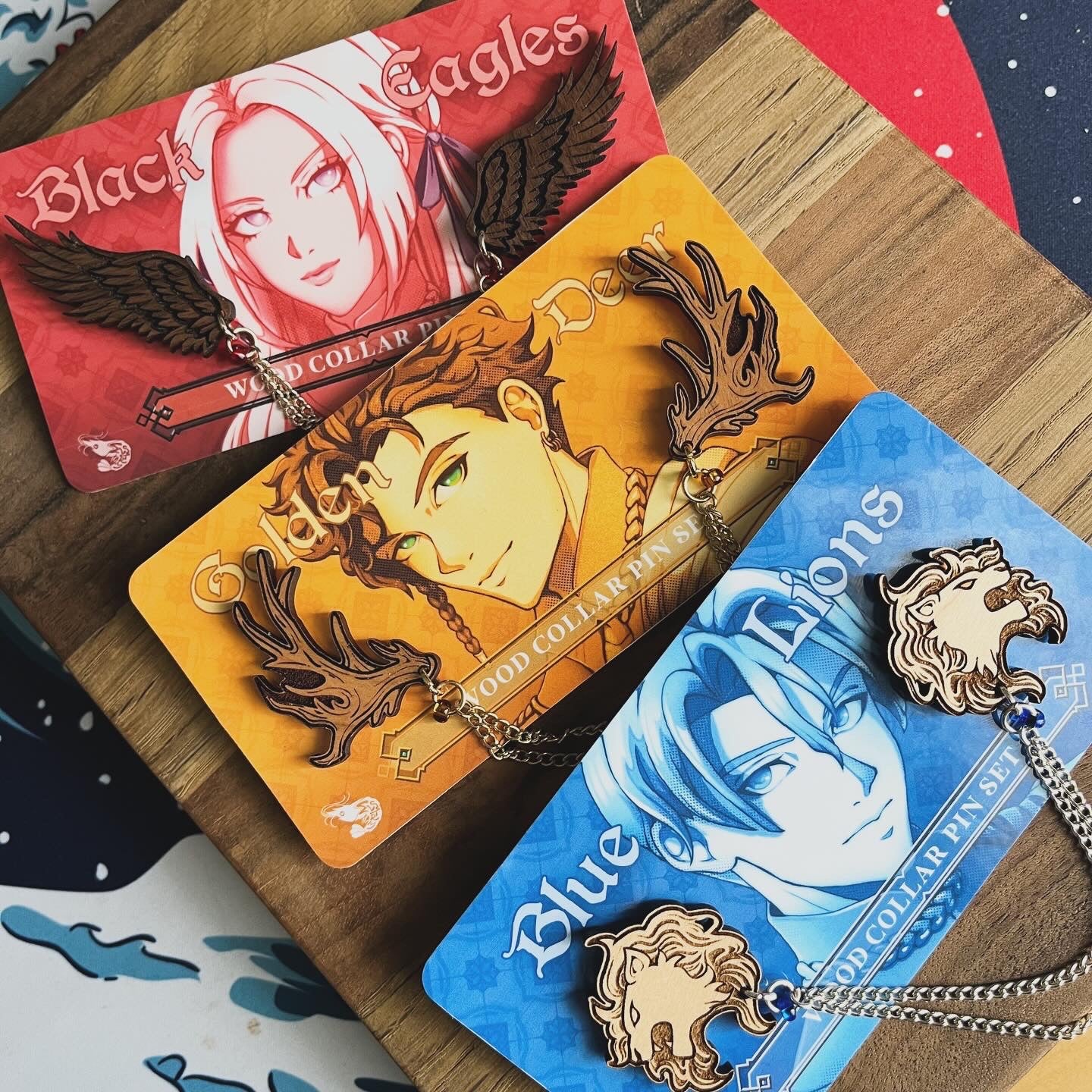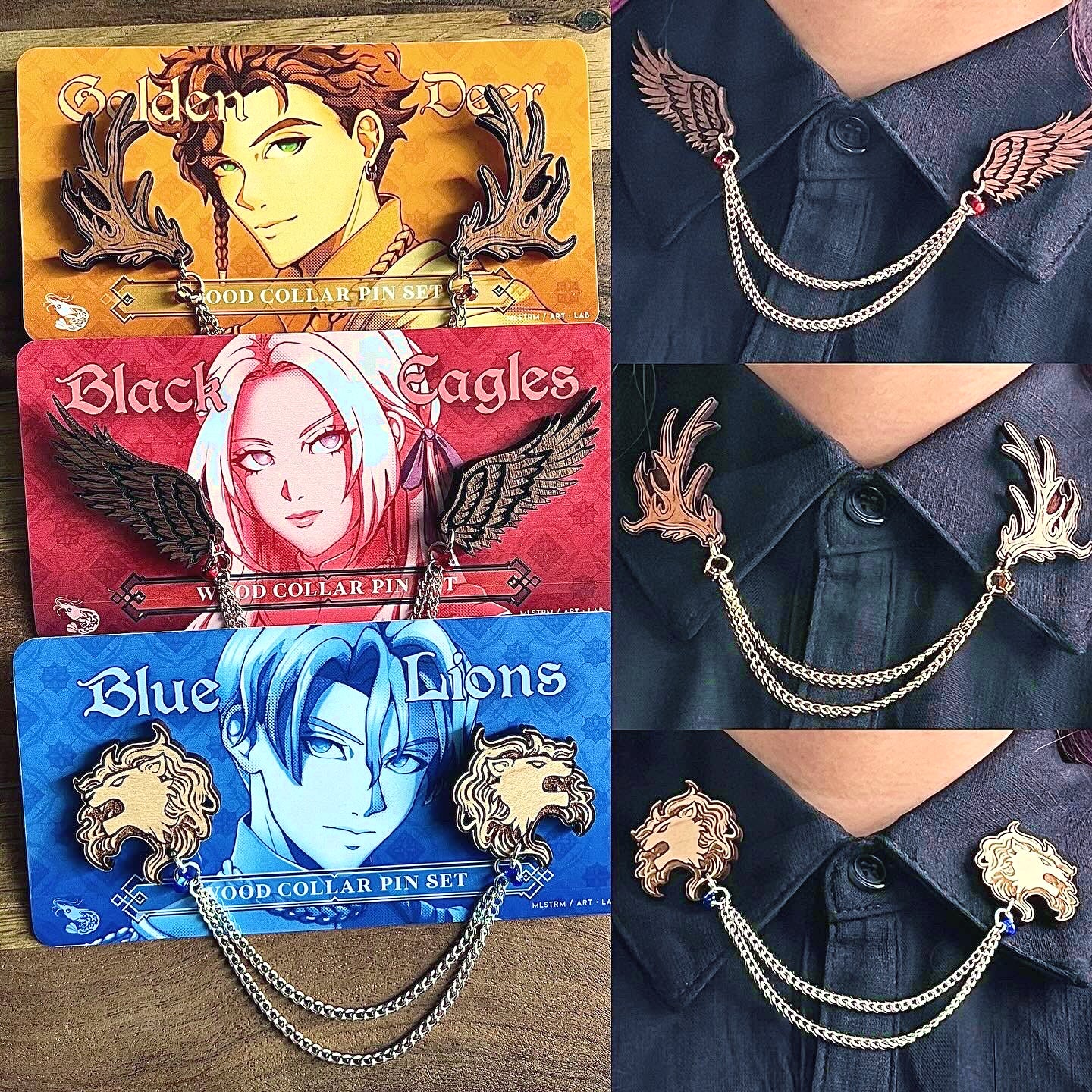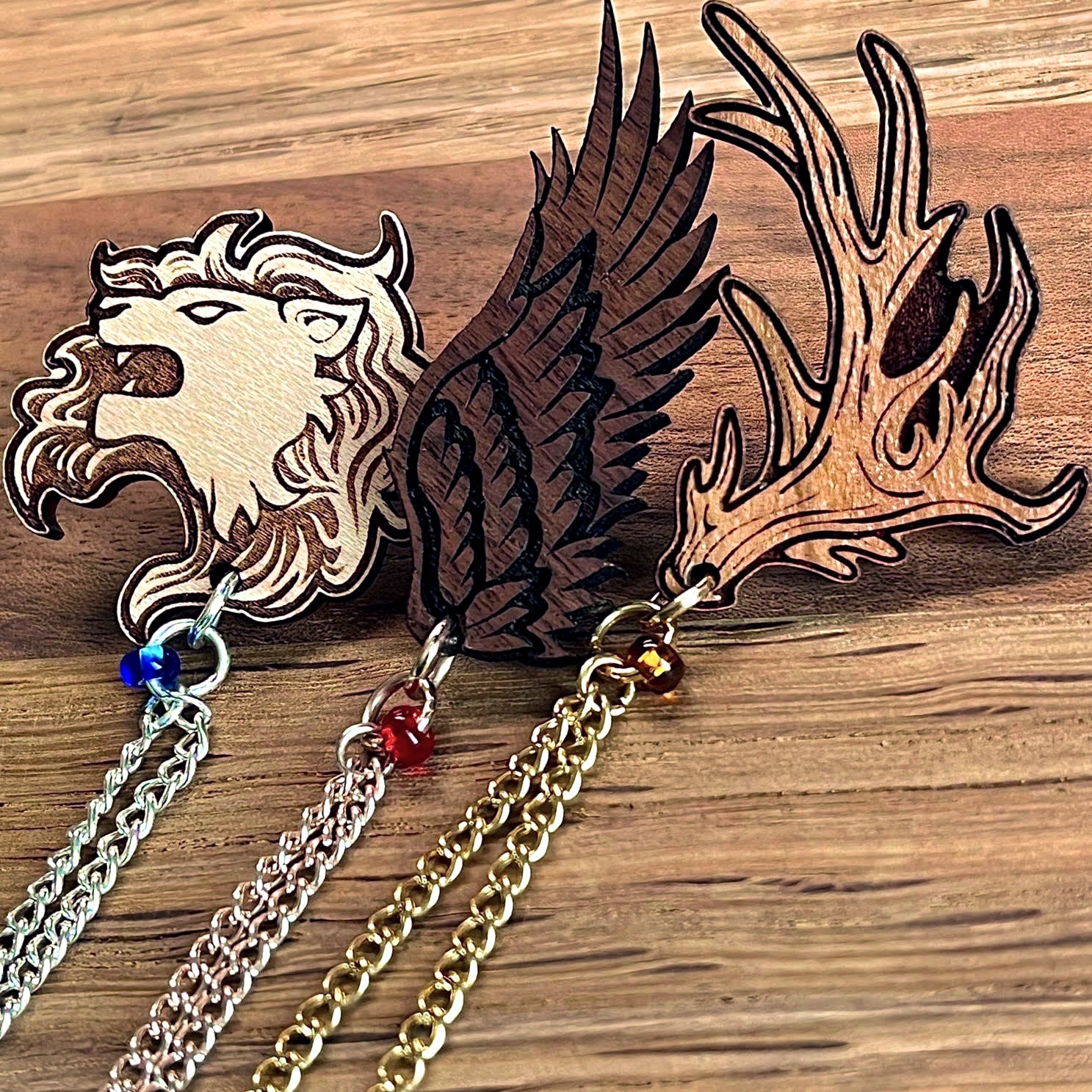 Homemade engraved wooden collar pins representing the Black Eagles, Blue Lions and Golden Deer. Each set features a different colored chain, glass bead, and Crest engraved on the back.