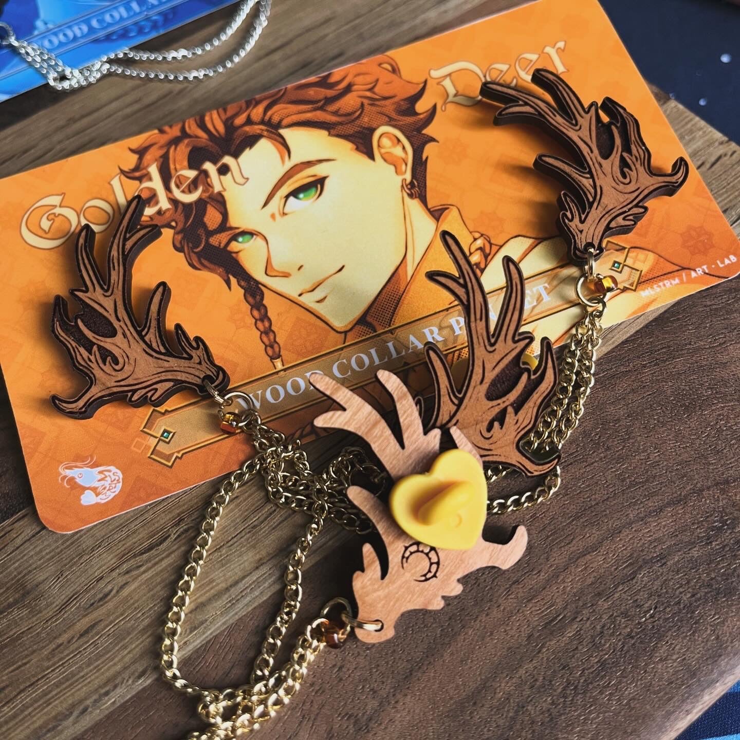 💛🦌 Golden Deer: engraved cherry wood with gold chain, and amber-colored glass beads and the Crest of Riegan