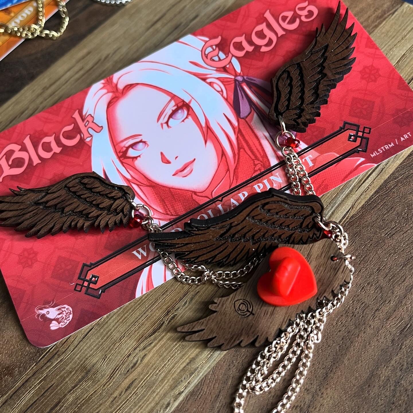 ❤️🦅 Black Eagles: engraved walnut wood with rose gold chain, and ruby-colored glass beads and the Crest of Seiros
