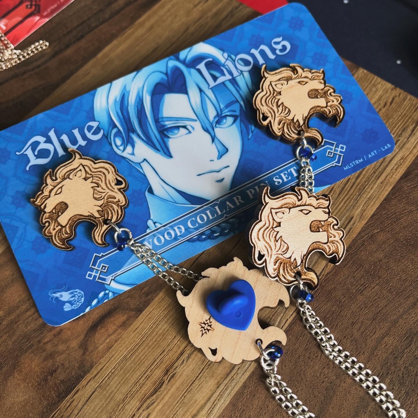 💙🦁 Blue Lions: engraved maple wood with silver chain, and sapphire-colored glass beads and the Crest of Blaiddyd